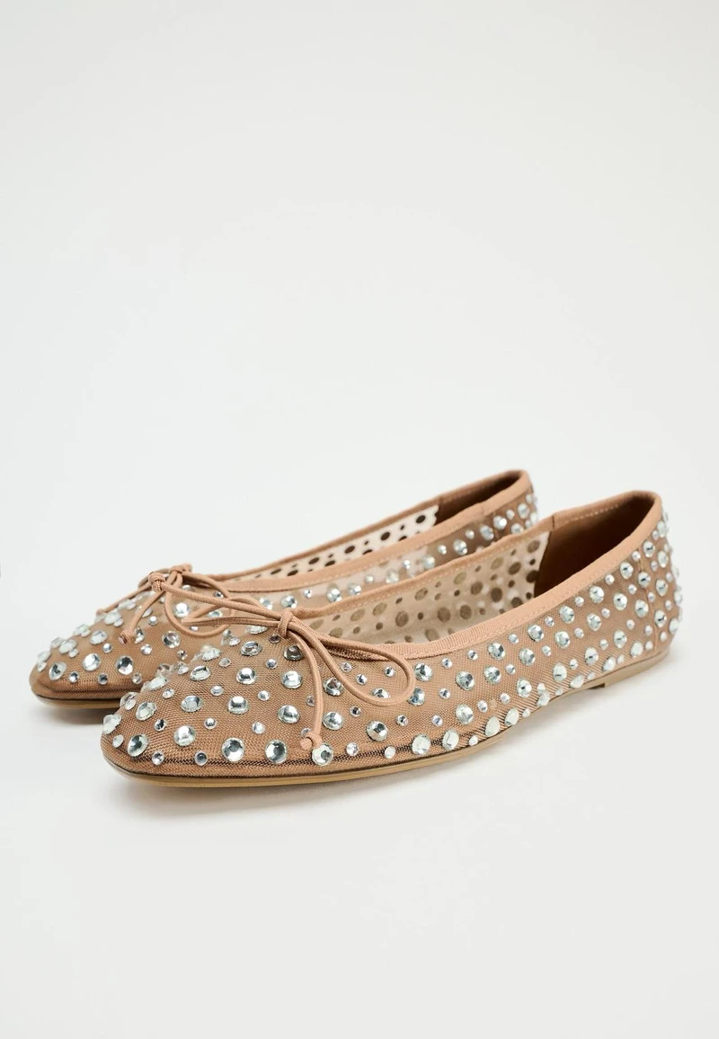 裸色的網眼平底鞋具有時髦的透視效果,鞋面上佈滿大小錯落的水鑽,正好降低布料的透明度,感覺沒這麼赤裸!