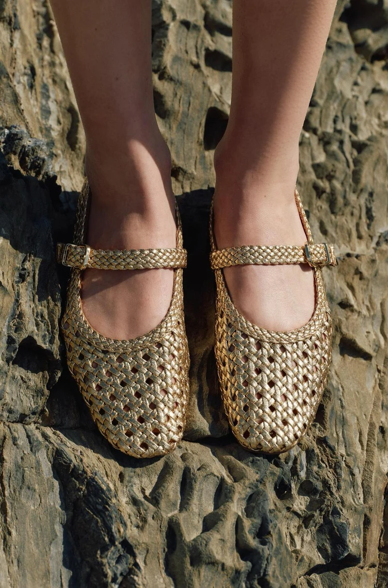 芭蕾舞鞋也能變化為夏季必備的草編鞋,塗上金屬光澤顯得特別亮眼,不用擔心太過浮誇,穿起來仍然保有優雅氣質。