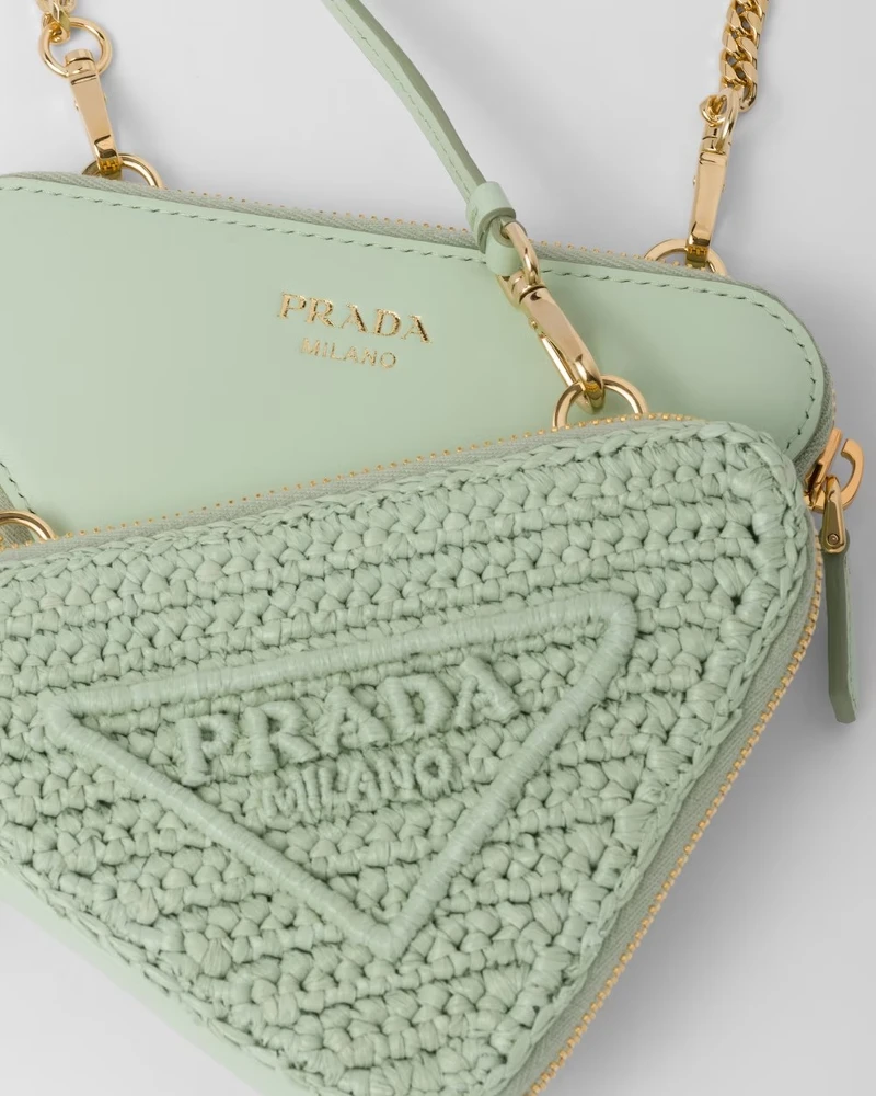 同樣以仿拉菲草材質編織成的手提包,包型小巧實用,鏤空的部分呈現三角形,以此致敬Prada的標誌元素,是個可愛的亮點!編輯亦有為讀者們準備開箱影片可以細細欣賞。