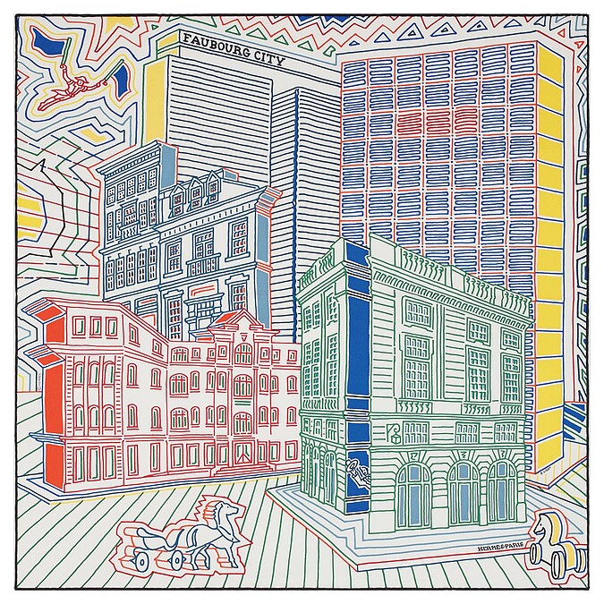 愛馬仕本季依舊推出了諸多款式的方巾,此條方巾以鮮亮顏色線條勾勒出全球旗艦店的建築外觀,包括福寶總店、以及位於首爾、東京、紐約……的旗艦店,你有看出來嗎?