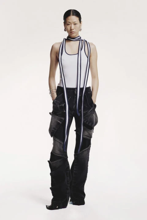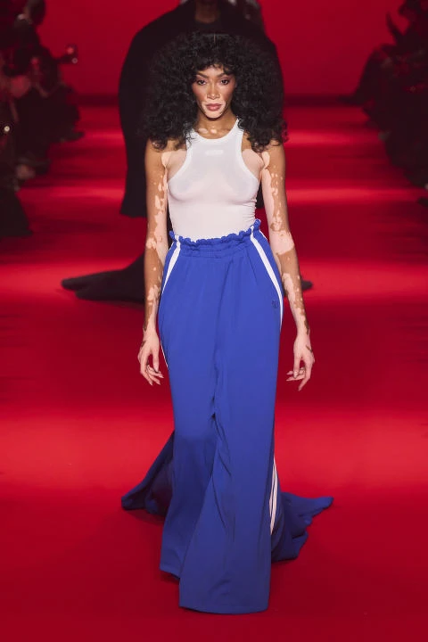 背心當然也能穿出 High Street 造型,像是 Vetements 在 2024 秋冬伸展台上,就以運動邊條的寬褲作為下身重點,營造上窄下寬的時髦輪廓。