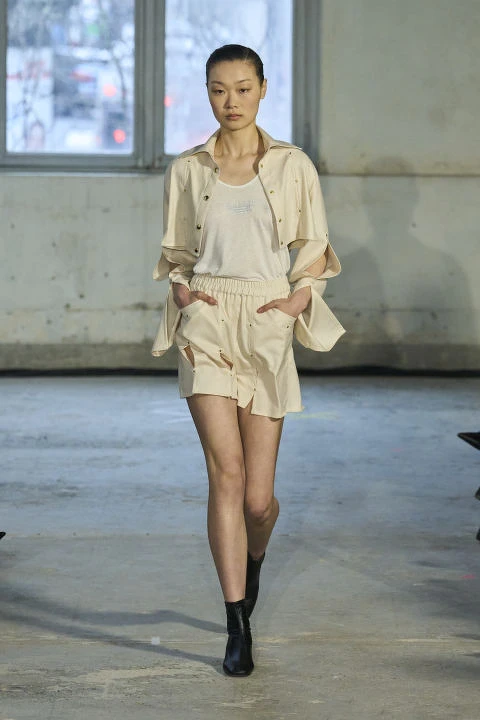 擅長營造中性風格的 Victoria Tomas,有著優雅的法式輪廓,在夏季進出冷氣房,你會需要一件薄外套作為搭配,此時可以選擇膝上短褲與短靴作為下身重點,運用同色系穿出悠閒自信。