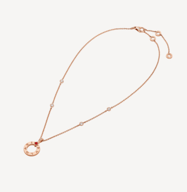 Bvlgari Bvlgari 項鍊特別款,18K 玫瑰金材質,吊墜鑲飾 1 顆紅寶石,售價NT$145,000