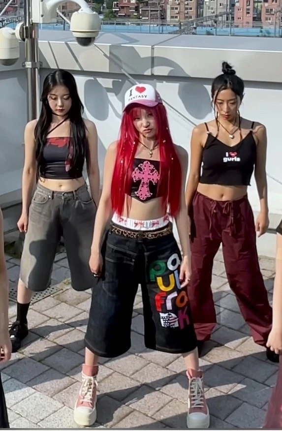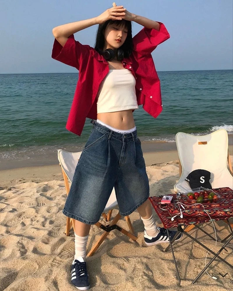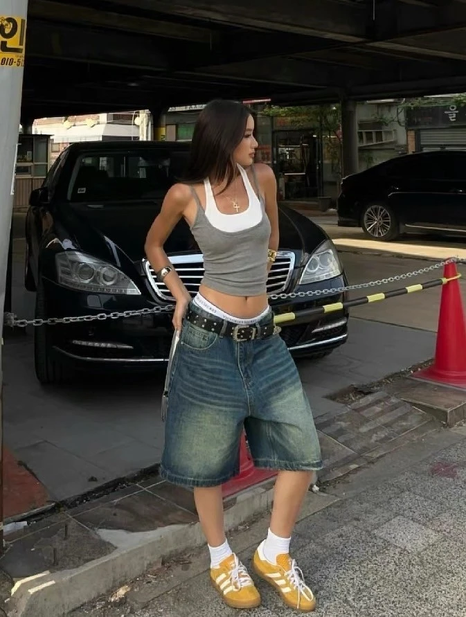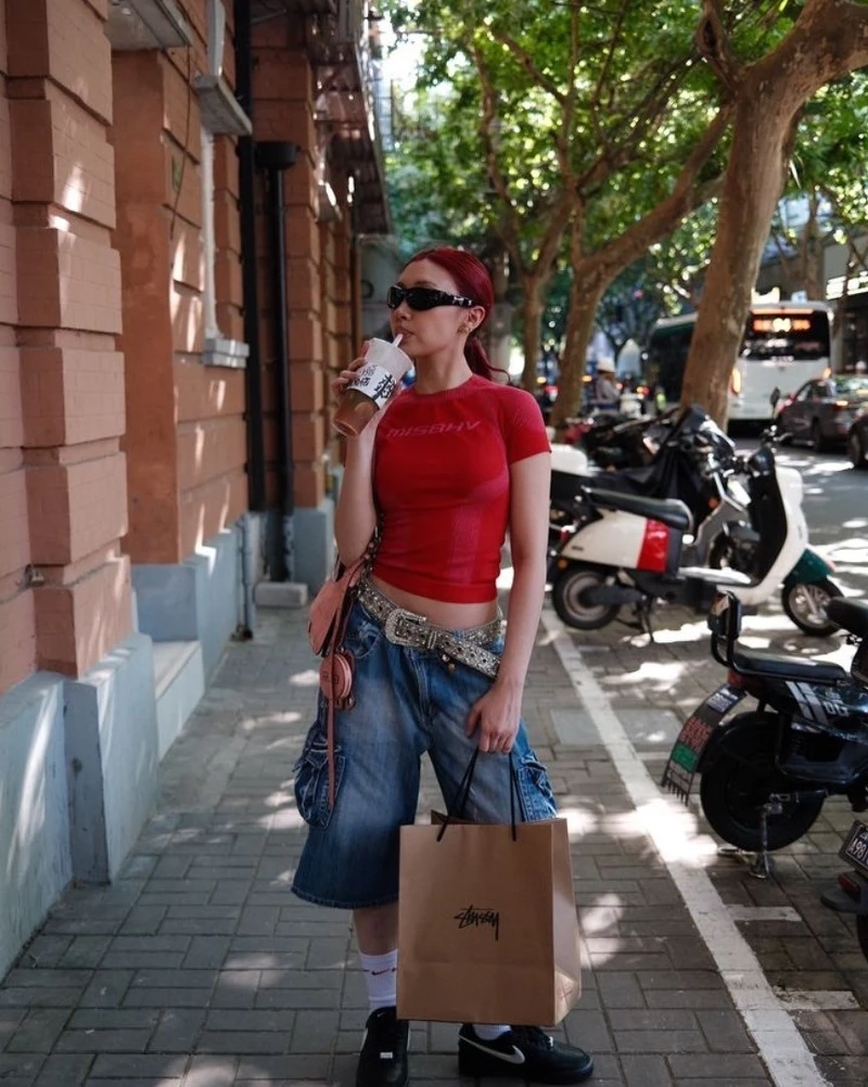 如果想要在原本的穿搭上增加一些亮點,可以看看(G)I-DLE宋雨琦的搭配方法,在牛仔五分褲的穿搭裡露出內搭褲頭,增添層次感之外,也給不喜歡露出肚臍、不習慣穿低腰褲的女孩們參考,也可以利用腰帶點綴,增強帥氣街頭感。