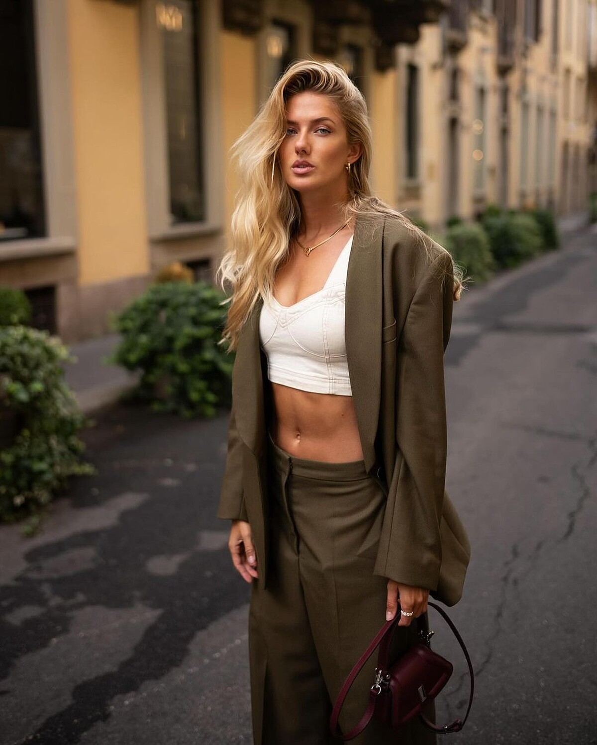 Alica Schmidt私下愛用中性輪廓的墊肩西裝、大衣,只要內搭一件貼身的短版Crop Top,即可完成帥氣與女人味平衡的穿搭,上、下同一色系的One Tone搭配方式,也是Alica Schmidt的慣用手法。