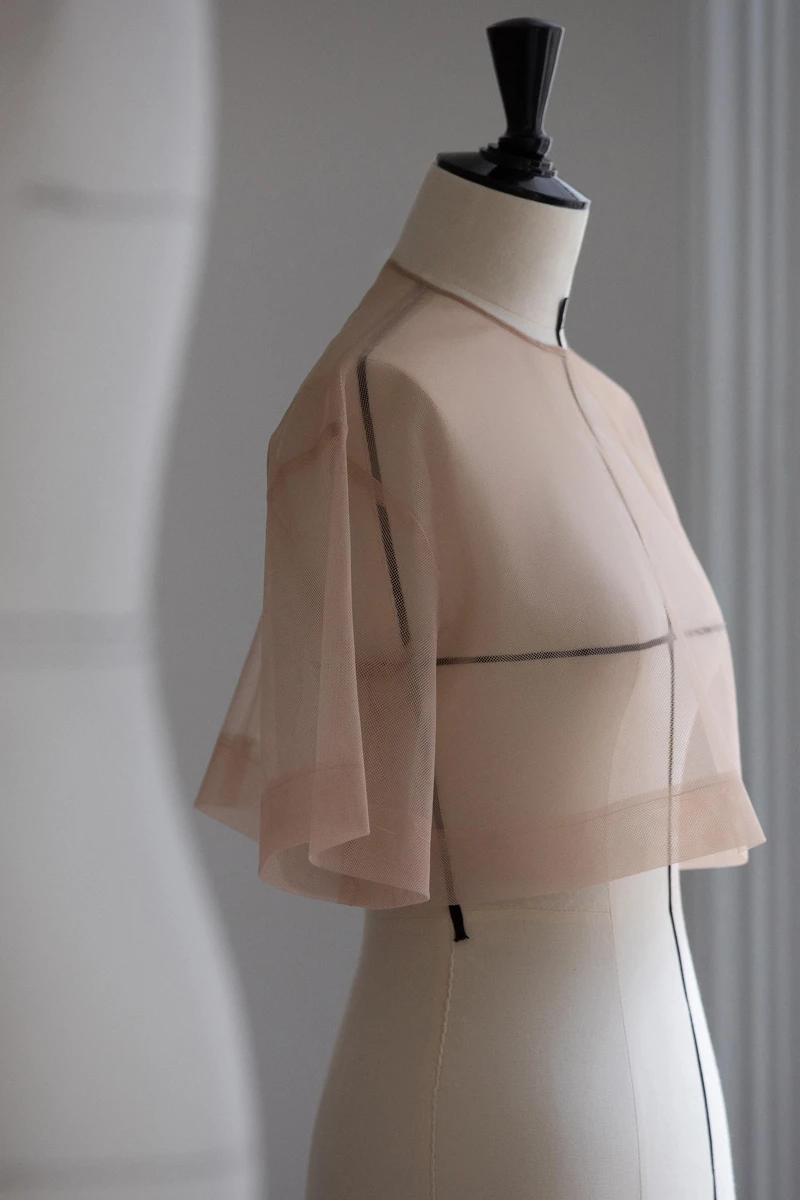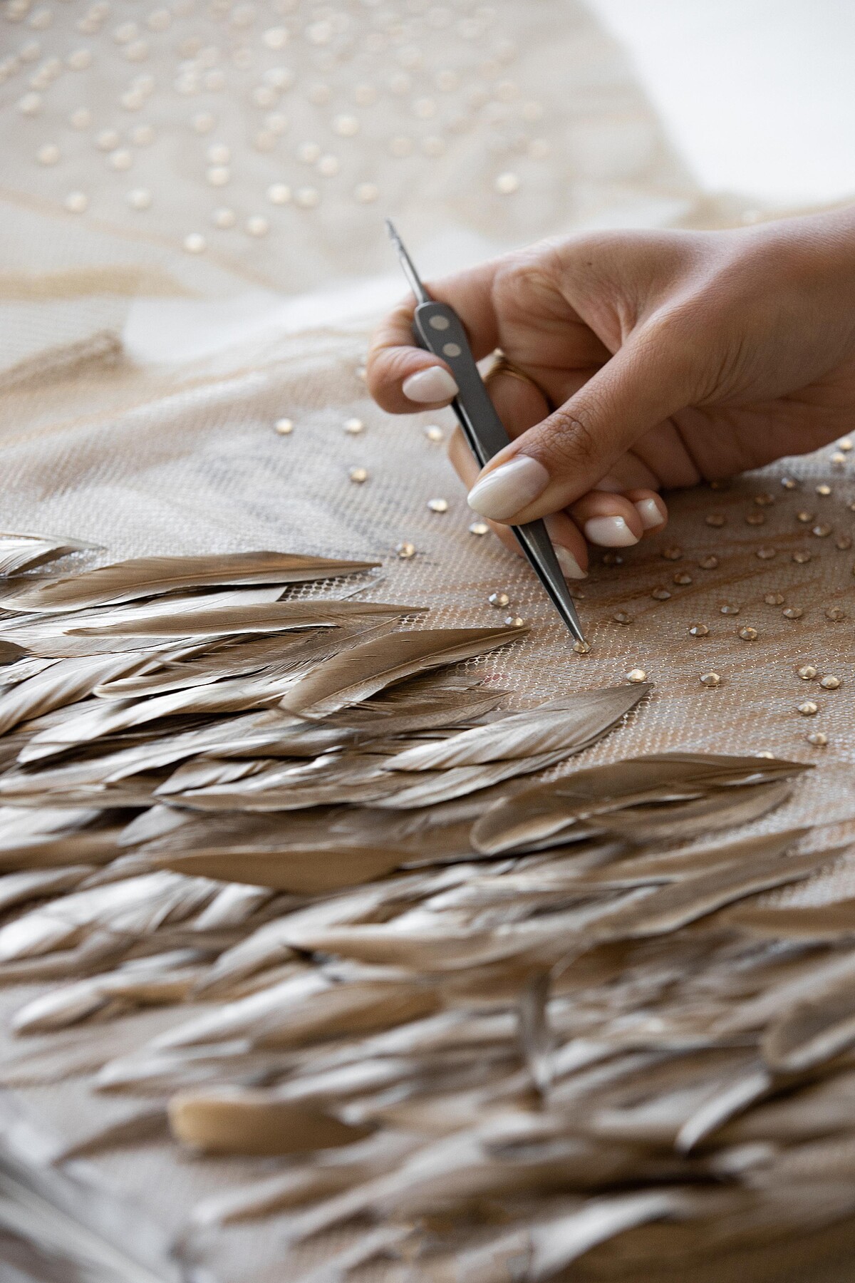 這些由精湛工藝製作而成的作品,是由數千根羽毛以手工方式一根一根地縫製而成,展現自然卻深具力量的風格意象,將眼光拉回 2016 年的首場 Dior 時裝秀,品牌當時就已為女性擊劍運動員的力與美致敬,這是表演藝術與時裝工藝的深刻對話,令人動容。