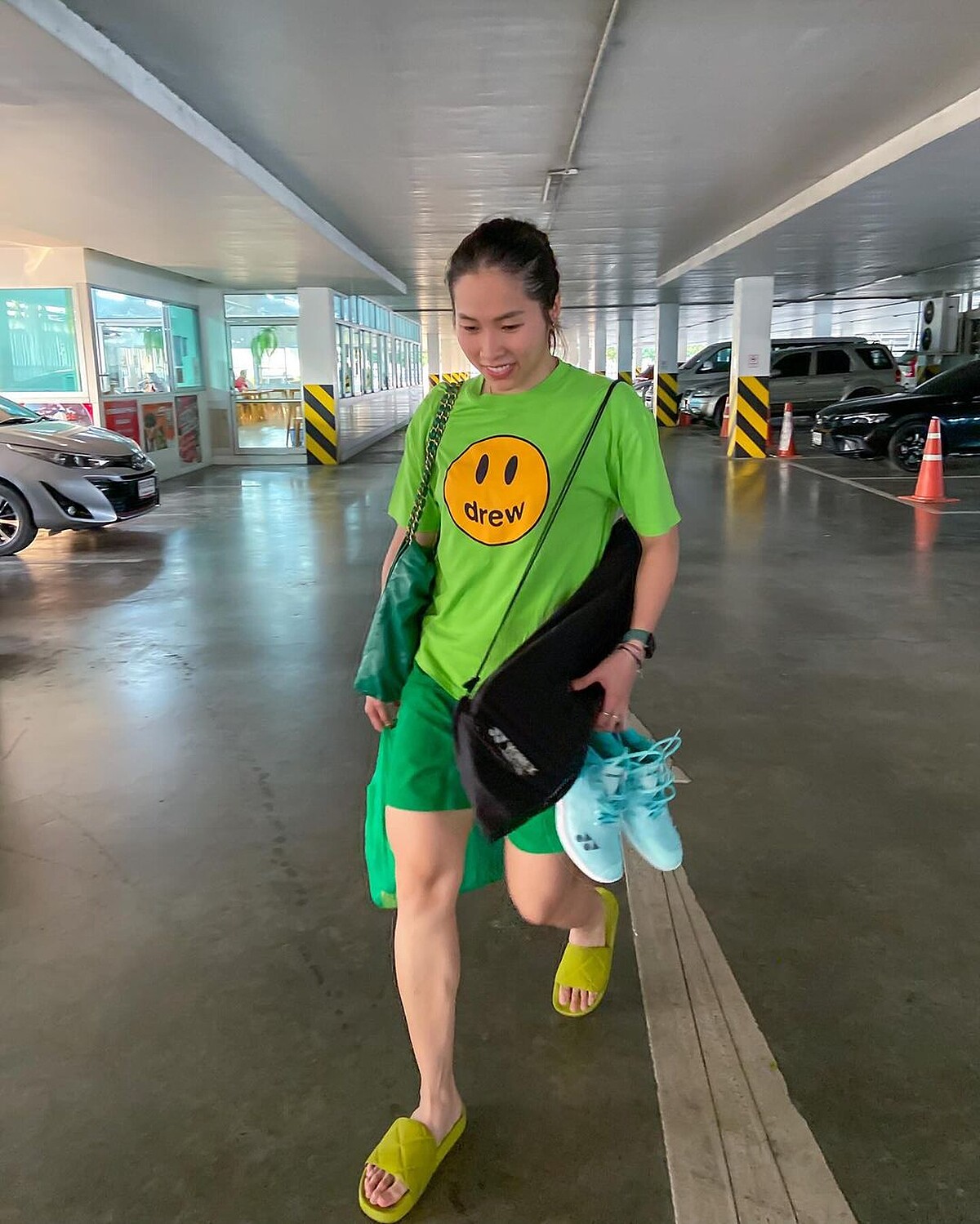 不只關注精品,依瑟儂也懂潮流!她在運動後換上輕鬆的笑臉T恤,正是來自小賈斯汀的個人品牌Drew House,整身綠色的搭配是她這套造型的關鍵。