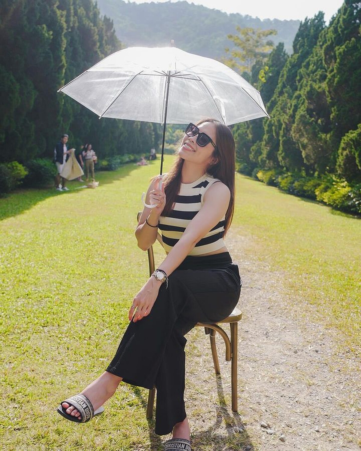 依瑟儂以基本的條紋背心休閒打扮,搭上一雙輕盈舒適的Dior拖鞋,享受陽光下的愜意氛圍。