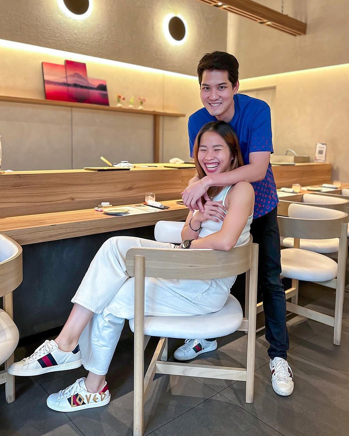 依瑟儂選擇Gucci經典的Ace織帶運動鞋作為與另一半的甜蜜情侶鞋,具有高識別度之外,更是非常的百搭、不易出錯。
