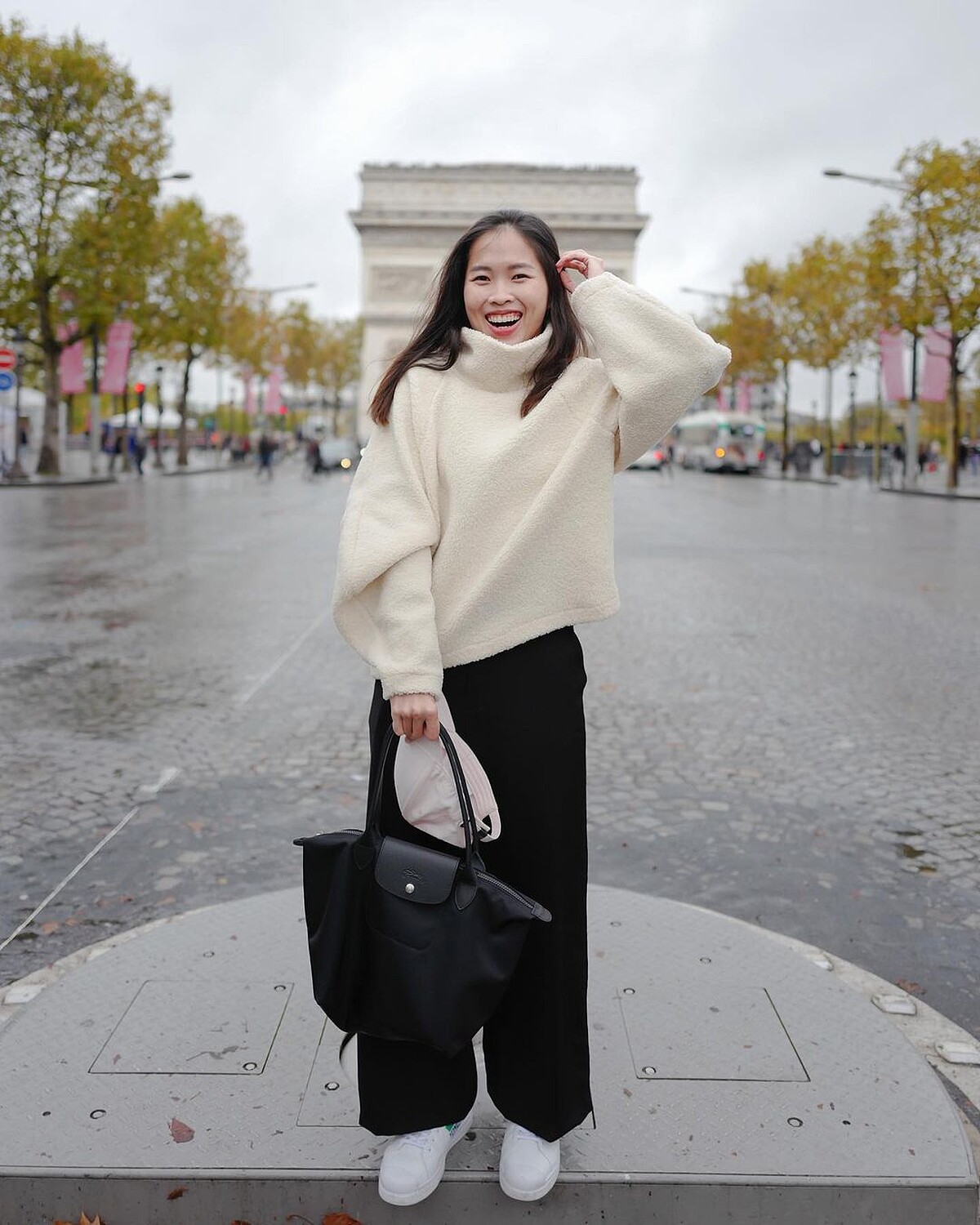 來到法國,依瑟儂也背上了源自法國的Longchamp最知名的Le Pliage摺疊包,輕盈、方便收納又具有大尺寸空間,作為旅遊使用特別適合,旅途中必備的證件、票券、充電器、紀念品……通通裝得下。