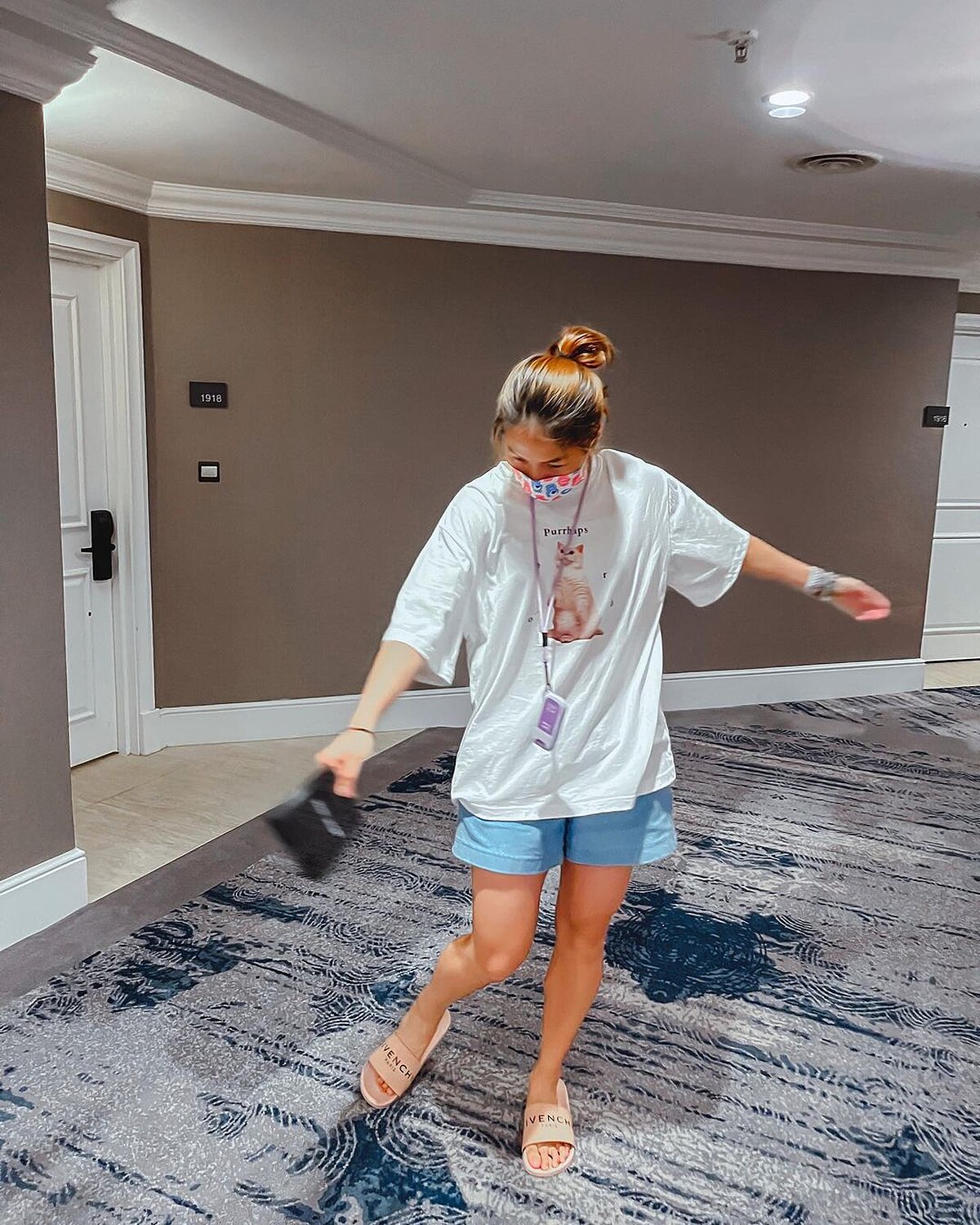 運動期間以外,依瑟儂經常選擇拖鞋來解放雙腳,而拖鞋可不是什麼藍白拖都可以,她有多雙精品拖鞋的收藏,像這張照片中,她在飯店裡穿著Givenchy的拖鞋四處走動,看起來是非常的舒適!