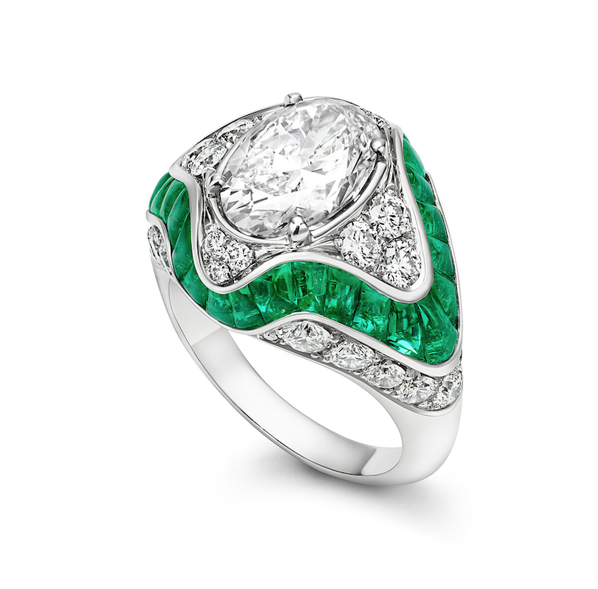 頂級鉑金戒指,鑲嵌1顆橢圓形切割鑽石(F VVS1重約2.51克拉)、28顆buff-top弧圓形切割祖母綠(總重約2.41克拉)與密鑲鑽石(D-F IF-VVS總重約1.62克拉)。