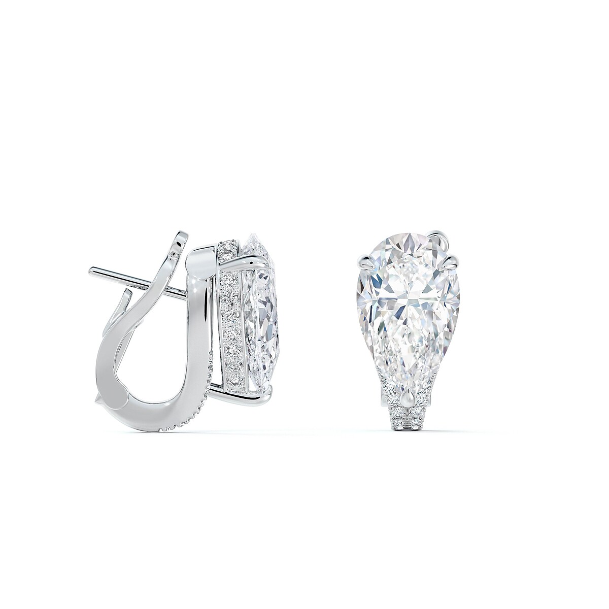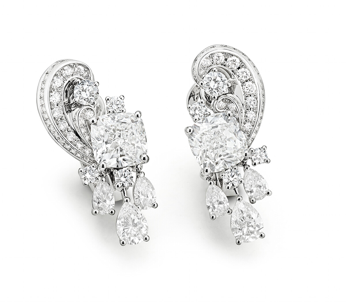 鉑金鑲嵌2顆枕形切割鑽石(E VS總重約4.02克拉)、6顆梨形切割鑽石(D-F VVS-VS總重約1.40克拉)、8顆圓形明亮切割鑽石與密鑲鑽石(D-F IF-VVS總重約0.93克拉)。