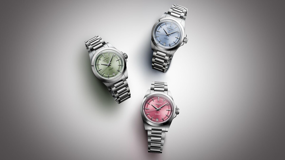 三針款,錶徑34毫米精鋼錶殼與鍊帶,冰心藍色、花瓣粉色、薄荷綠渦漩太陽放射紋面盤、鍍有Super-LumiNova®夜光塗料(時針與分針),浪琴表L888.5自動上鏈機械機芯,防水100米,售價NT$ 66,300~NT$ 69,900