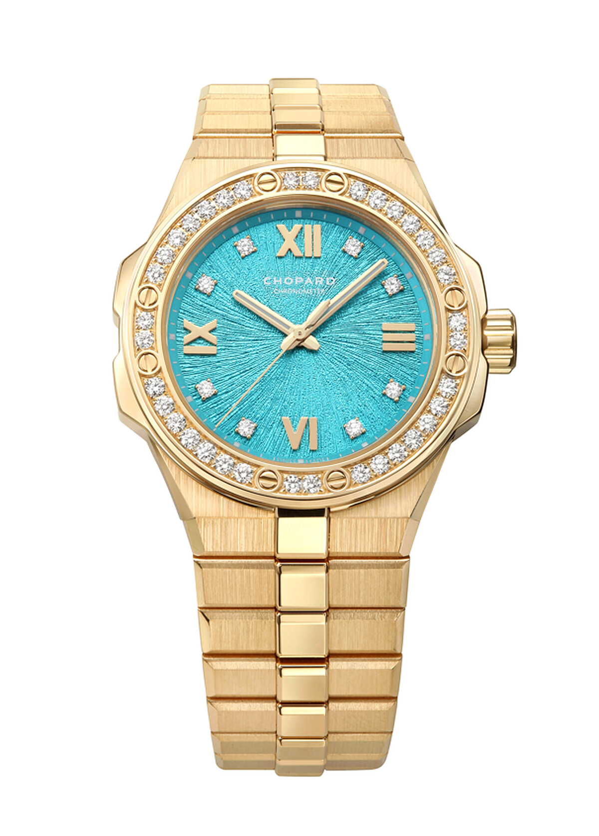 直徑33毫米符合倫理道德18K金錶殼與鏈帶,海洋藍色刷紋面盤,Chopard 01.01-C型自動上鏈機械機芯,動力儲存42小時,瑞士官方天文台認證(COSC),定價NT$1,589,000