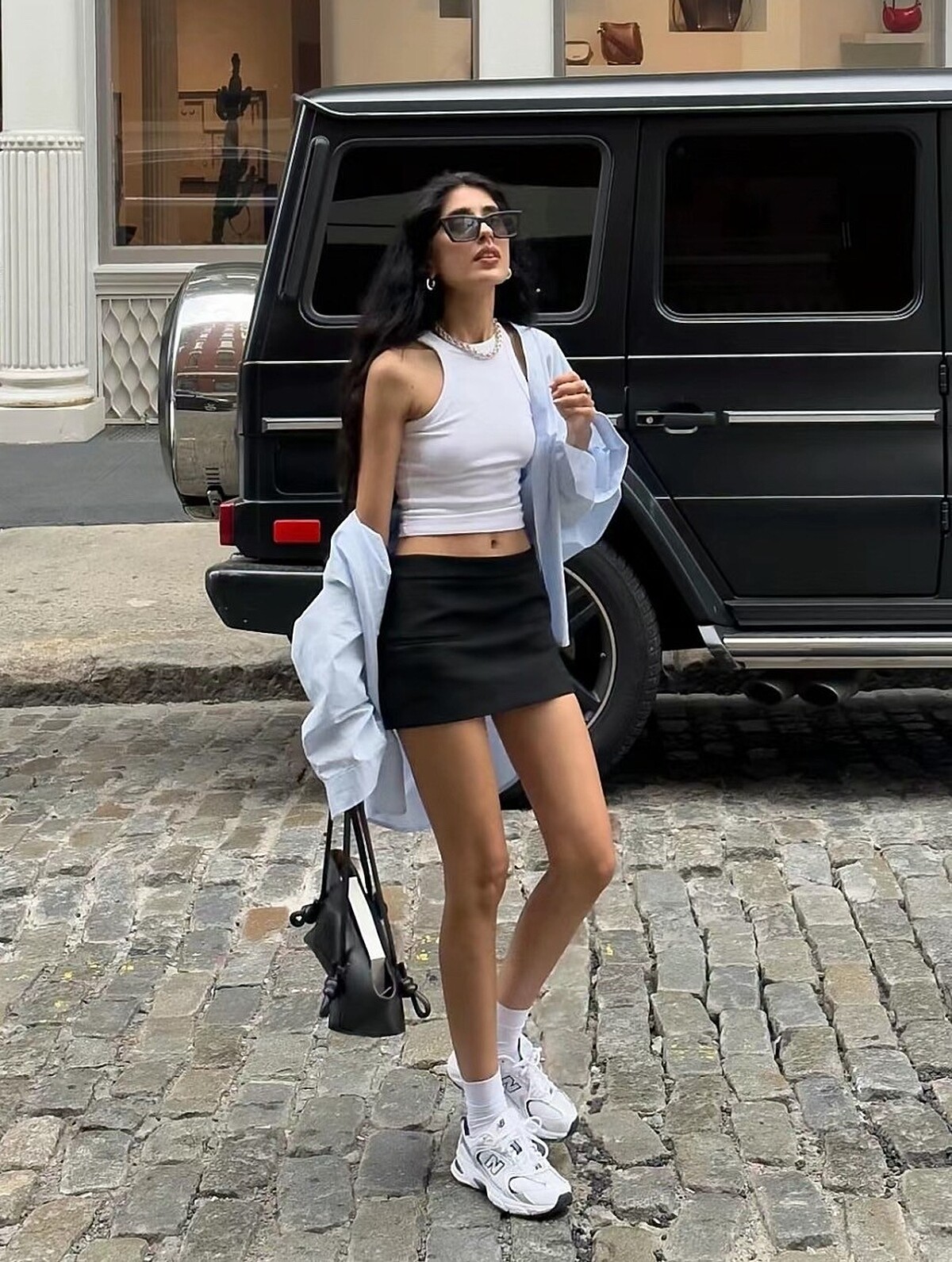 短版背心也是很基本的單品,簡單短裙或牛仔褲都百搭,而像這樣基本的單品就非常適合利用層次搭配穿出豐富感,比如一件襯衫外套在夏天可以防曬,也可以遮住害羞的手臂肉肉。