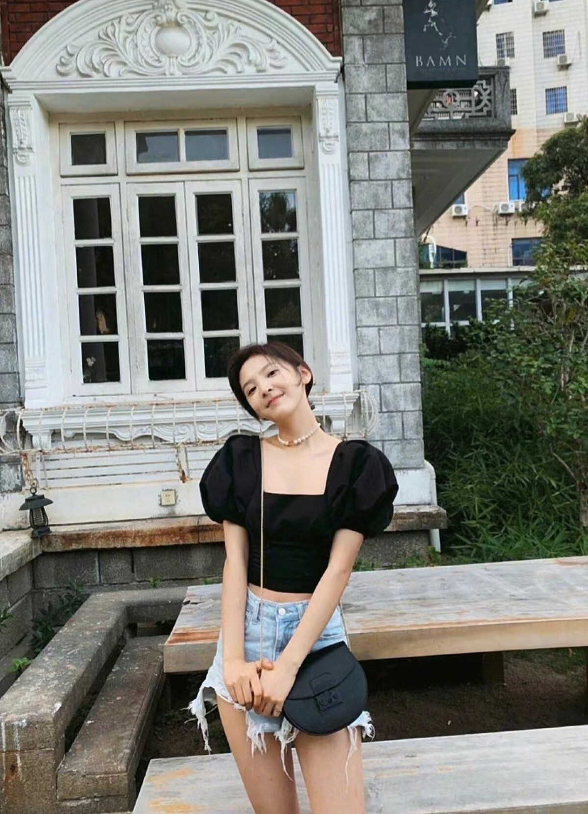 泡泡袖設計拉寬肩膀比例,短版設計凸顯腰部線條,隨性搭配一件牛仔短褲,有股甜美浪漫的風情,窄肩女孩這樣穿真的好美!