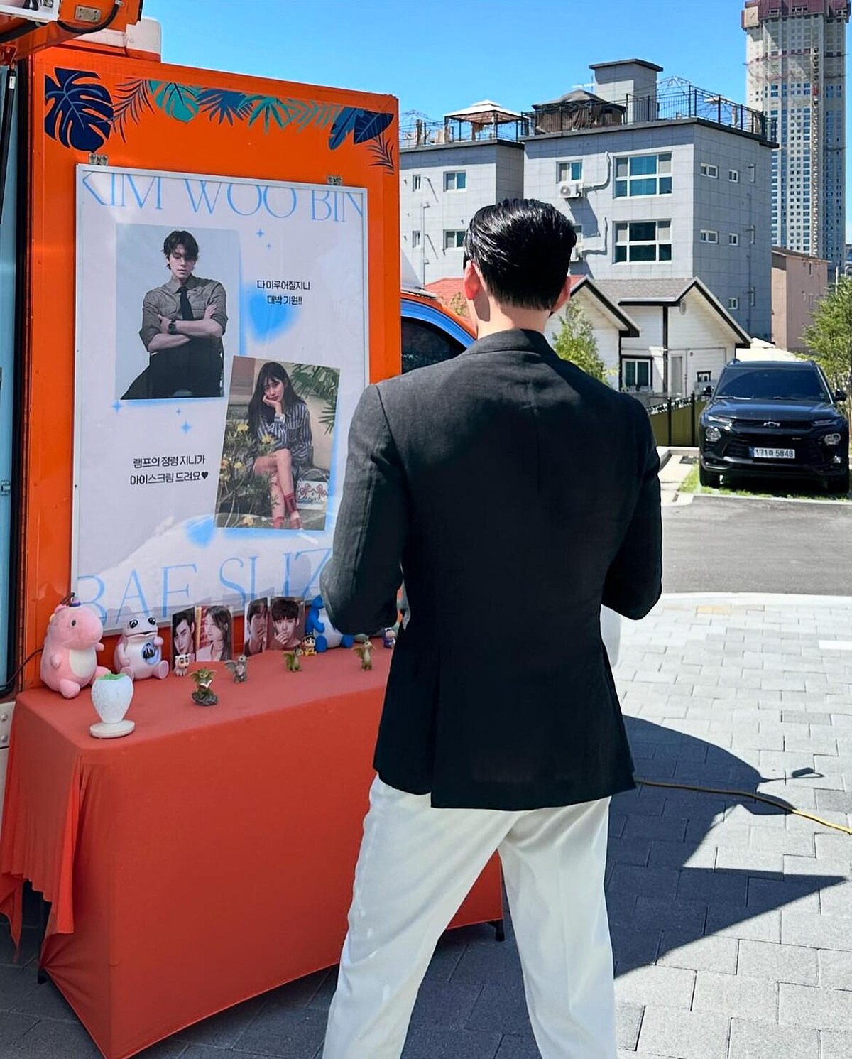 這套黑西裝搭配白褲從正面看較為平凡無奇,但從背面看便讓人為他的太平洋寬肩驚呼,別忘了金宇彬才抗癌成功復出沒多久,要練回這麼壯碩的身材可真是不容易!