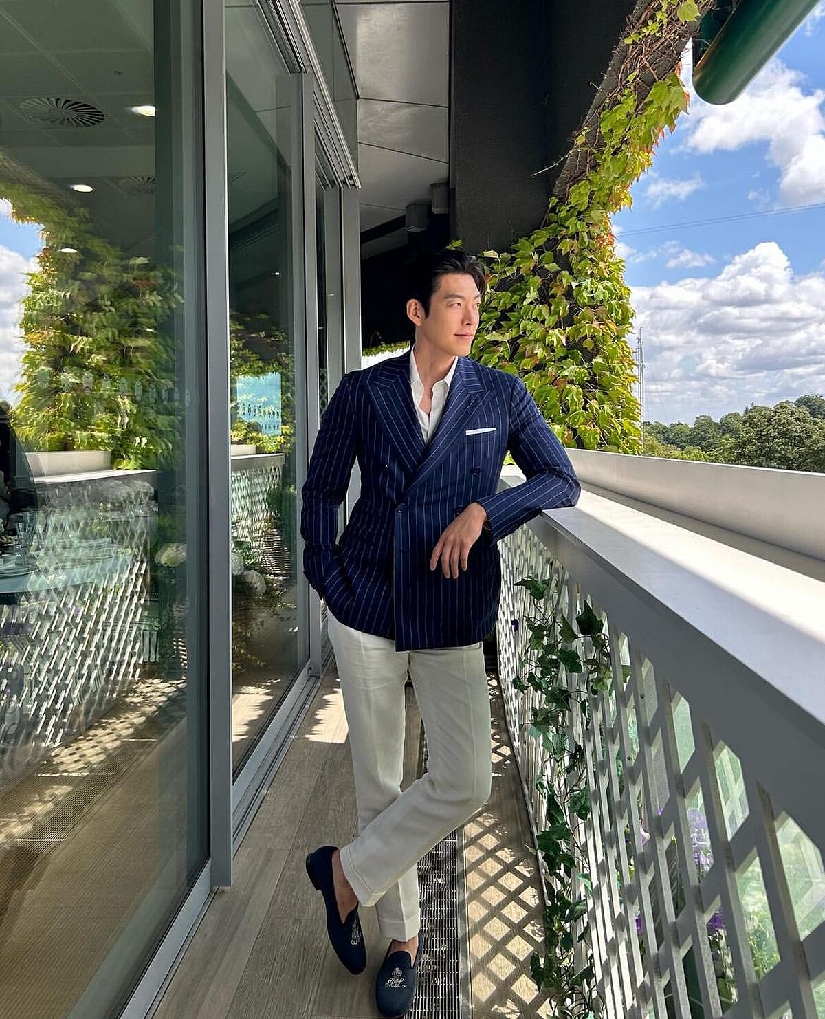 去年溫布頓網球賽時,金宇彬以Ralph Lauren的藍色條紋西裝、白色褲裝造型現身看台,內搭襯衫敞開、腳下踩著樂福鞋,正式而不拘謹。