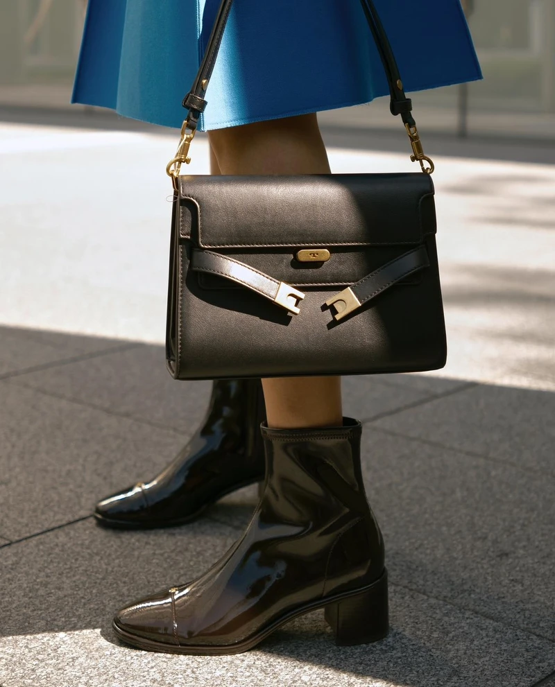 其實在2019年秋冬,Tory Burch便曾推出以Lee Radziwill女士為靈感誕生的包款——Lee Bag,保存了其簡約高雅的外型,2024秋冬以此為基底推出了嶄新的Lee Radziwill包款,Lee Radziwill延續簡練方正的包型,採用德國小牛皮和西班牙荔枝紋小牛皮製成堅韌細膩的質感,前方垂掛的繫帶,則是重現Lee Radziwill從容慵懶的經典設計,看似嚴謹卻有著微妙的鬆弛感,凸顯女性的自信光芒。