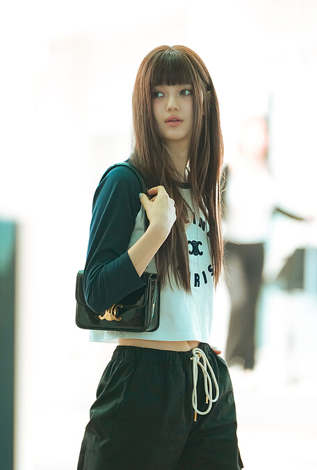 NewJeans Danielle示範全新Teen Garance包款的隨性切換穿搭,這次機場穿搭裡,就以輕鬆的Logo棒球T配上肩背,十足的青春活力。