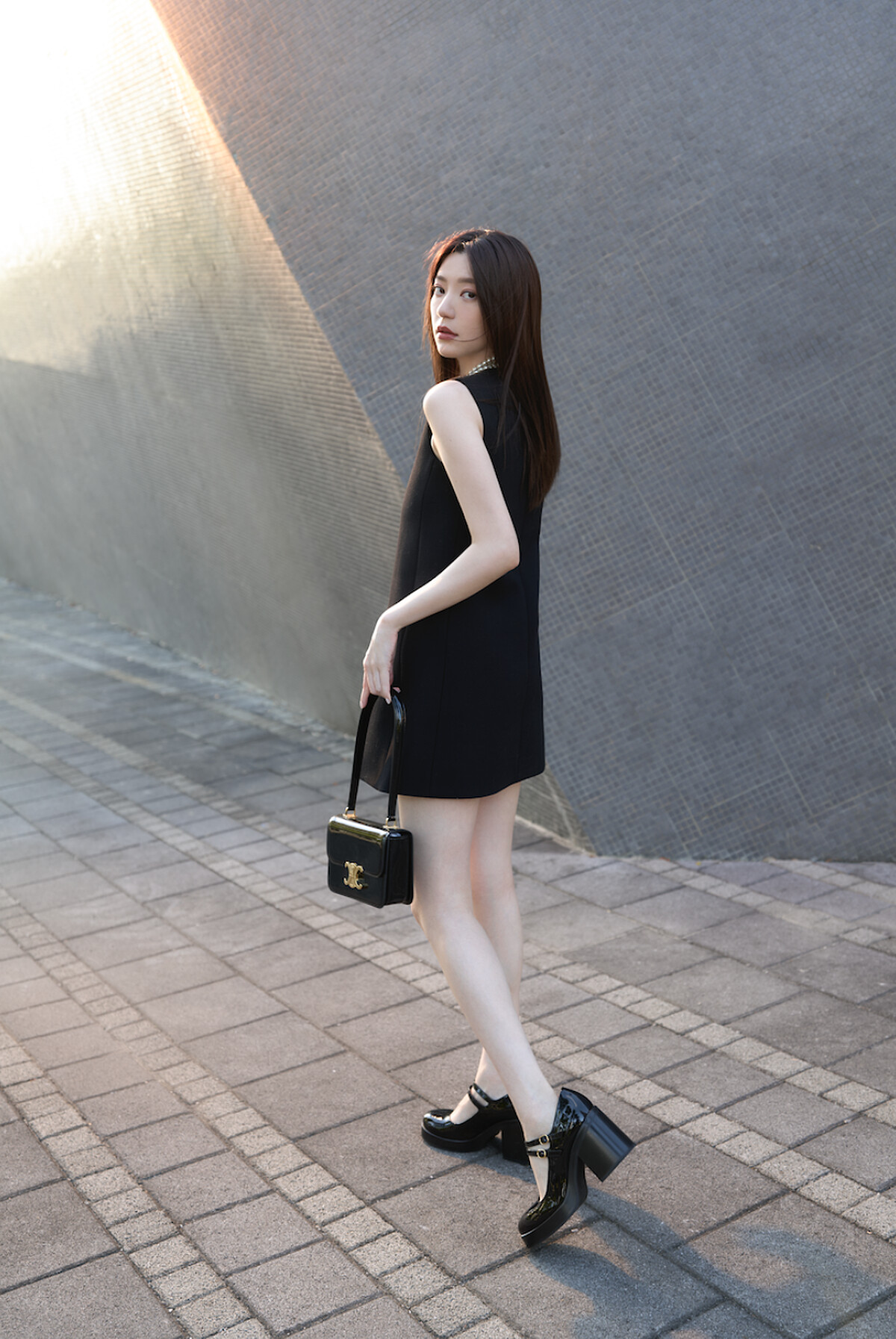 台灣女身郭雪芙一身黑色雅致的迷你連衣裙,彷彿回到60年代的復古情懷氛圍,Triomphe標識與漆面皮革相得益彰,以全新Teen Garance包款演繹法式的摩登日常。