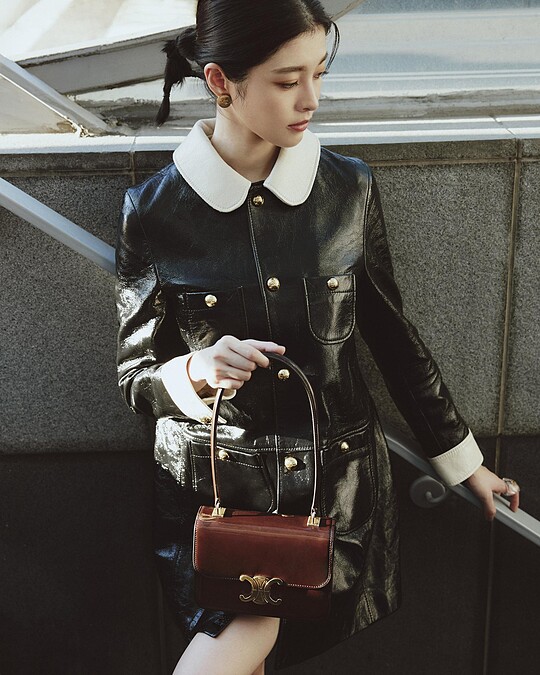 Z世代女星詹子萱以一套漆面小羊皮娃裝外套展現Celine冬季女裝的復古優雅風,包款上他以Teen Garance棕色皮革款式凸顯品牌摩登的韻味,是簡約型格穿搭靈感的首選。