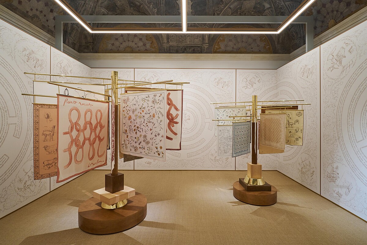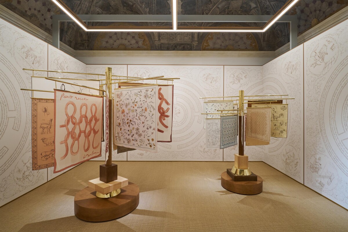 本次2025春夏系列展示會於貝爾吉奧伊奧索宮(Palazzo Belgioioso)舉辦,現場更結合了藝術裝置空間,讓嘉賓們能透過沉浸式體驗感受系列所傳達的精神。「All About Linen」空間展示了頂級纖維,可以從牆壁到地板上的黃麻混紡面料家飾、木質花鑲板發現率性自在的夏季氛圍,藝術家Adriana Meunié探索最純粹的亞麻姿態,為這項面料帶來藝術性的表達方式。