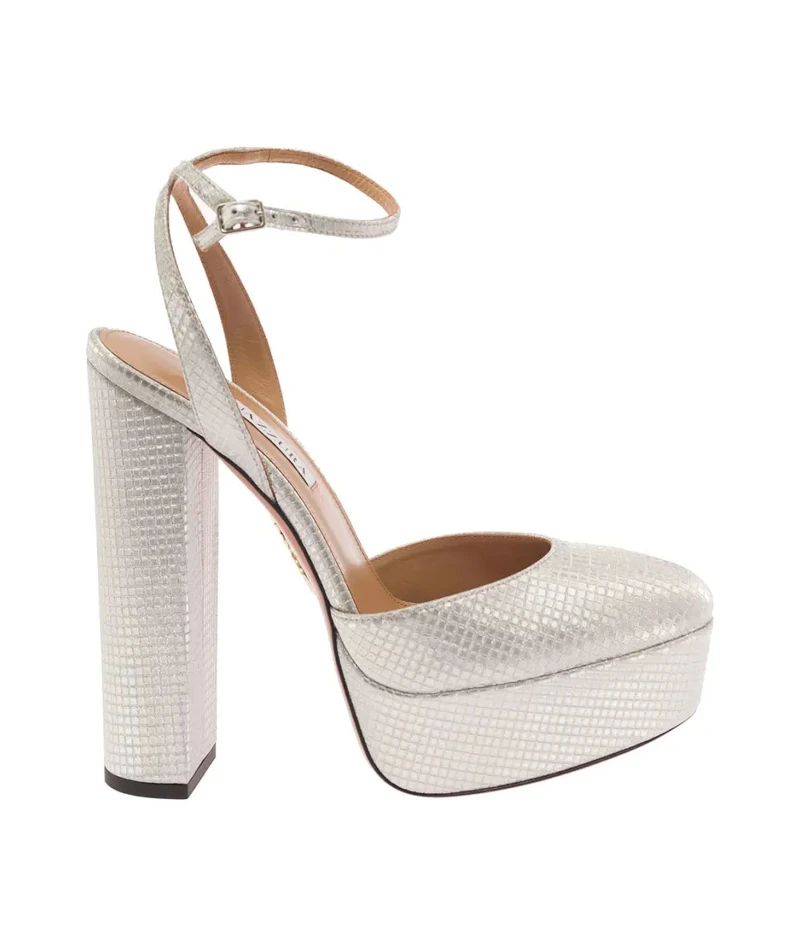 相較上一雙較為低調內斂,AQUAZZURA 這雙金色厚底繫帶跟鞋,除了厚底設計能拉長身形,粗跟設計也讓行走更舒適,全金色設計更是能輕易成為焦點。