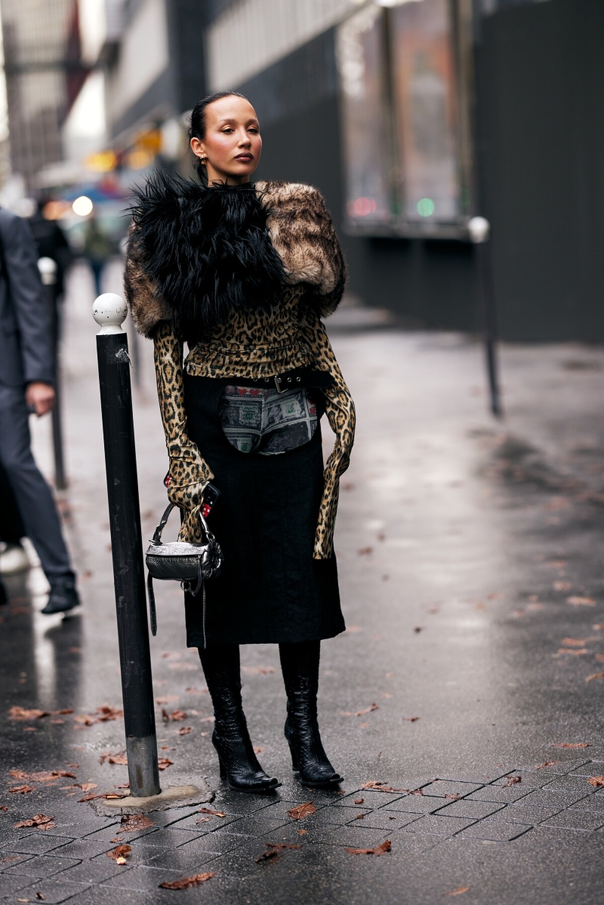 這組搭配充滿個性又街頭的風格,麂皮的柔軟和皮革的挺闊質感形成對比,增添了造型的層次感,看起來有叛逆的魅力。