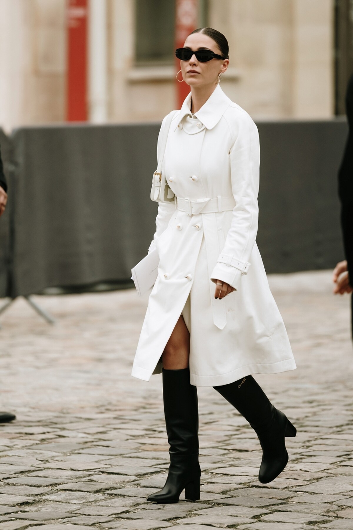 這套搭配展現出簡約高雅的氣質,白色風衣清新脫俗,而長靴則增加了幹練和大方的元素,是都市女性的經典造型。
