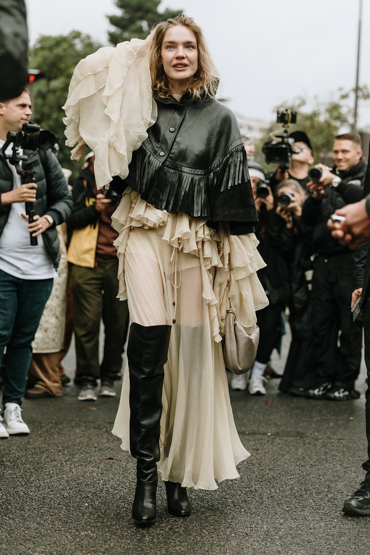 這組搭配散發出復古浪漫氣息,澎裙的柔美與膝下靴形成鮮明對比,澎裙的蓬鬆感能讓整體造型更具層次感,展現出一種優雅且精緻的美感。