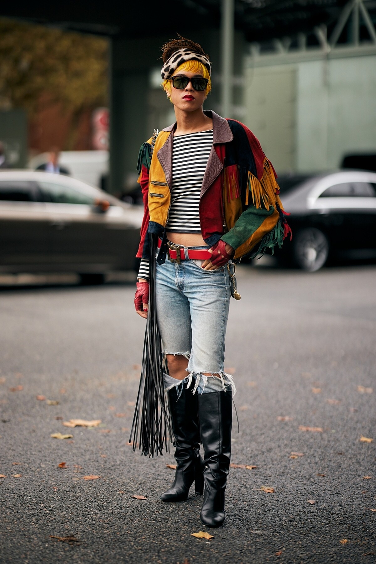 這套穿搭充滿大膽的街頭感,五分牛仔褲的隨性感搭配尖頭長靴,既有復古韻味又充滿現代時尚感,這種風格適合追求個性且不落俗套的穿搭愛好者。