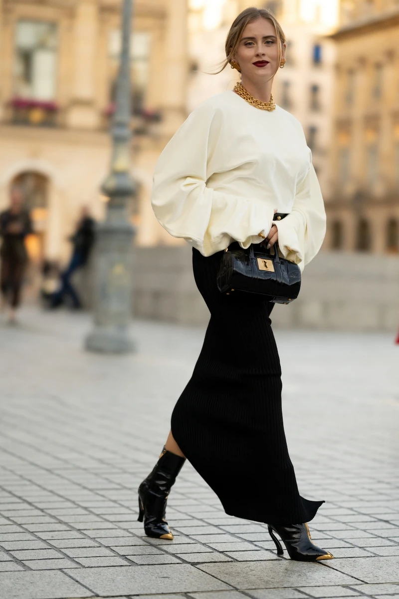 長裙的柔和與尖頭踝靴的時尚感完美結合,尖頭踝靴不僅能提升整體的優雅感,還能讓腿部線條看起來更為修長,適合日常或場合稍微正式的穿搭,展現出成熟又充滿品味的氣質。