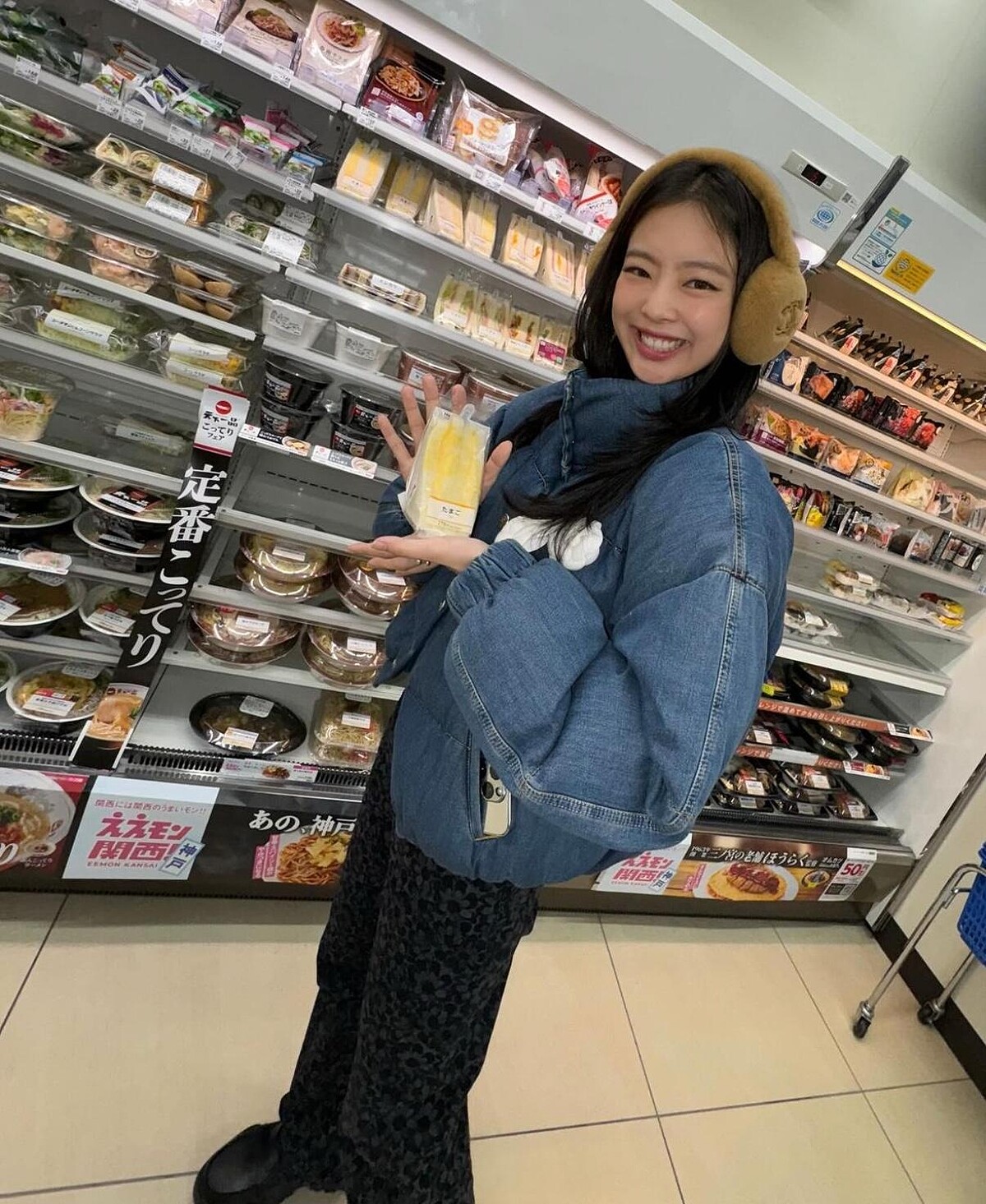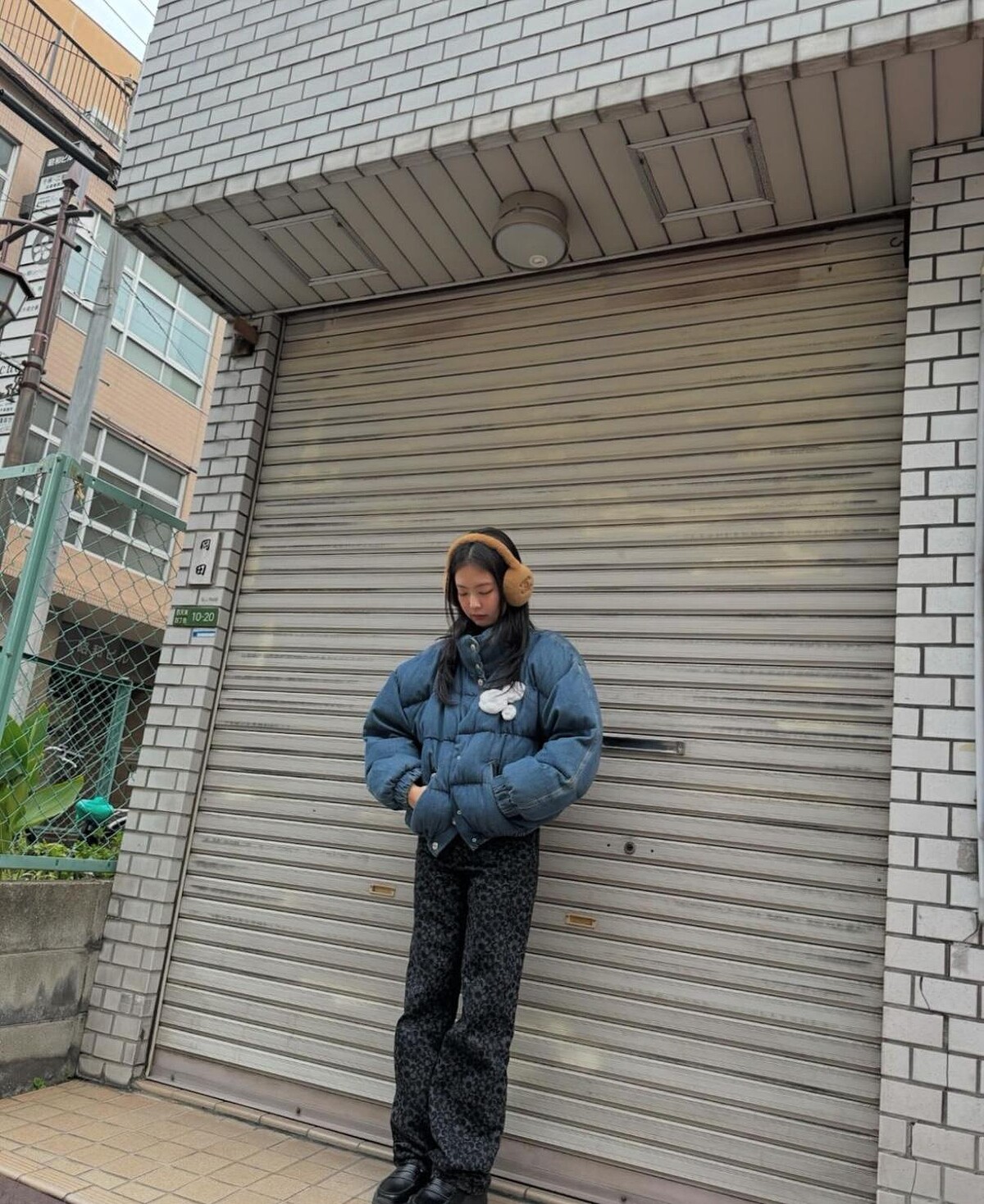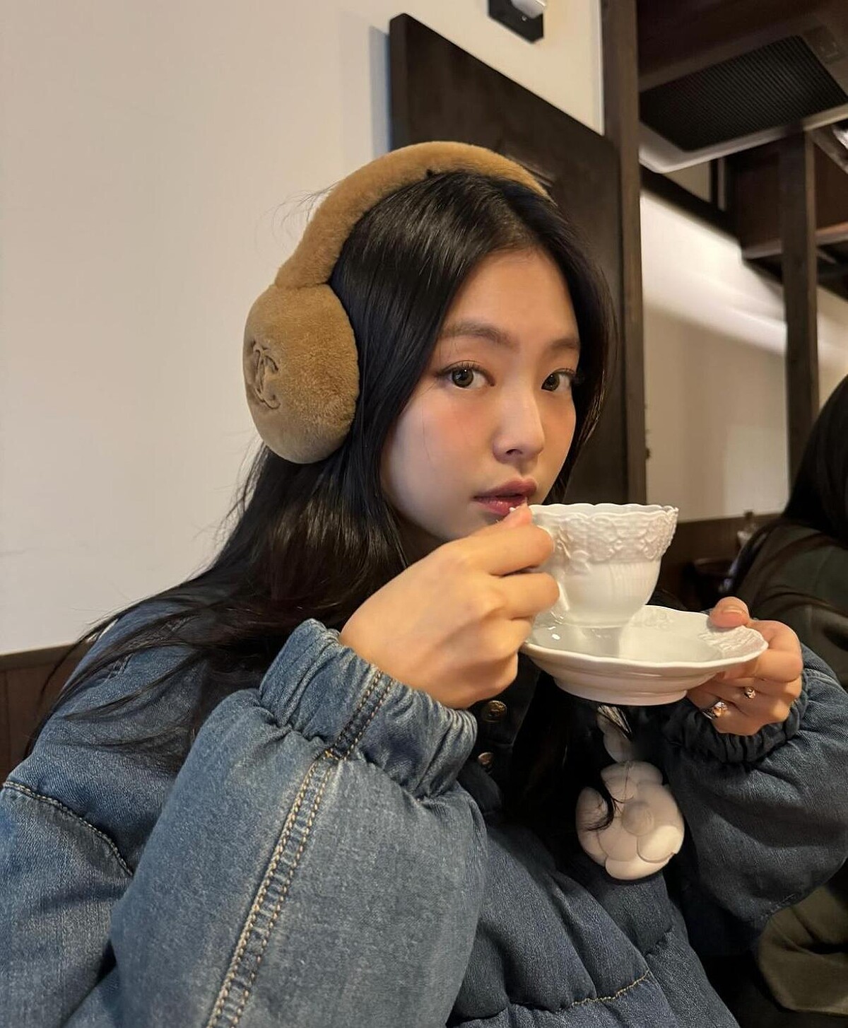 Jennie以藍色羽絨外套搭配同款圖案的深色牛仔褲,最後再戴上啡色耳罩,溫暖的毛茸茸設計,立即為一身打扮注入可愛的時尚感,配上一杯暖呼呼的熱飲,就是冬季甜美療癒啊。