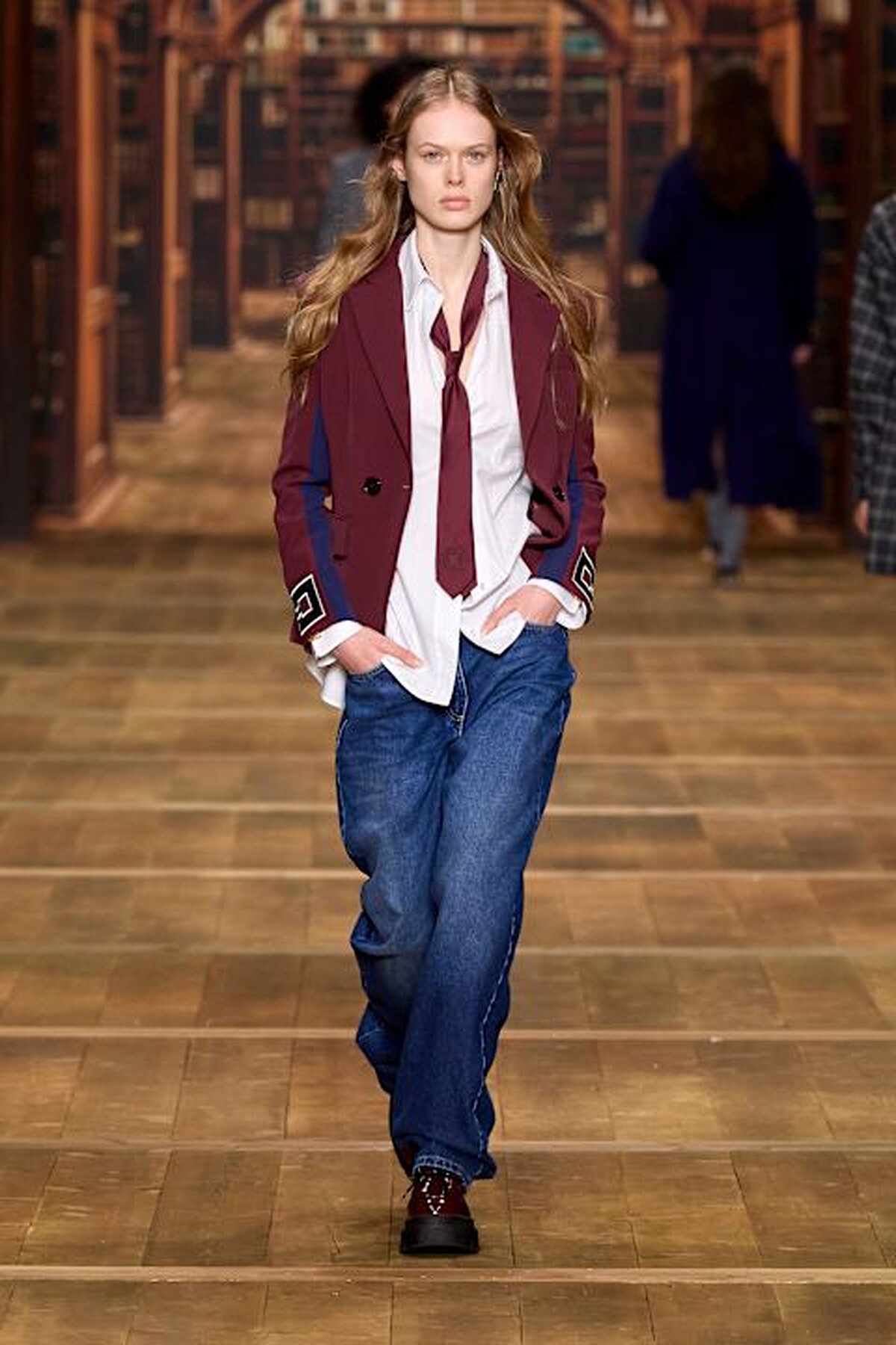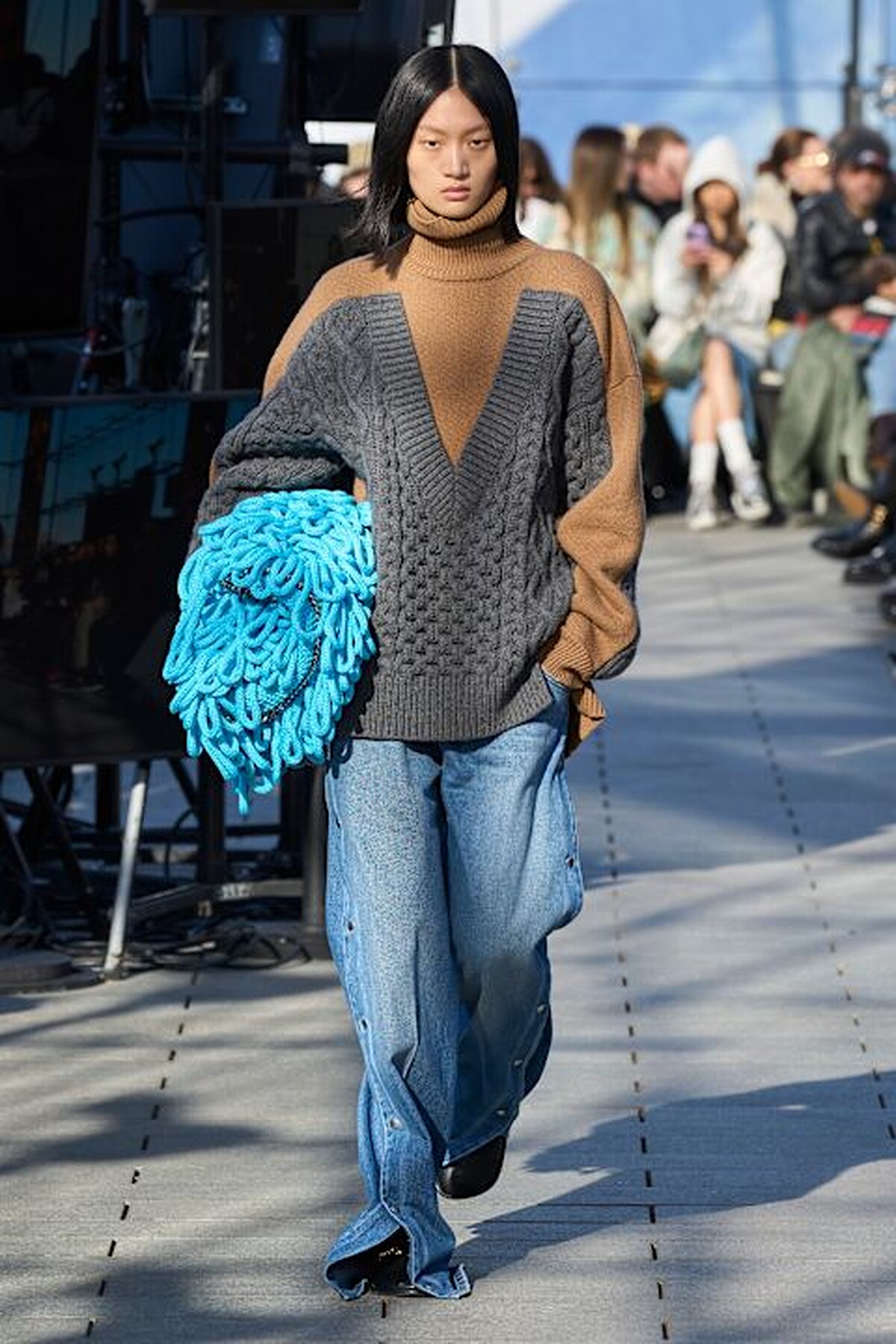 寒流來時你不妨跟身旁的男友或先生借用他的針織毛衣,參考 Stella Mccartney 秋冬秀上造型,寬鬆落肩的版型搭配同樣寬鬆的丹寧長褲,最後採上一雙時髦皮鞋,展現舒適與外型兼具的鬆弛造型吧!