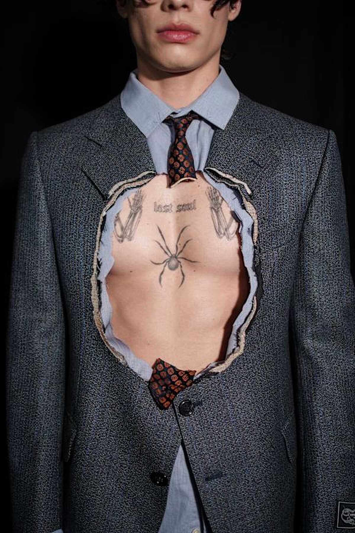 極具先鋒個性的 Vetements 也在本季秀台上以大膽的破壞挖洞手法詮釋了原本拘謹的正裝,將皮膚化做造型的一部分,性感、自信又大膽。