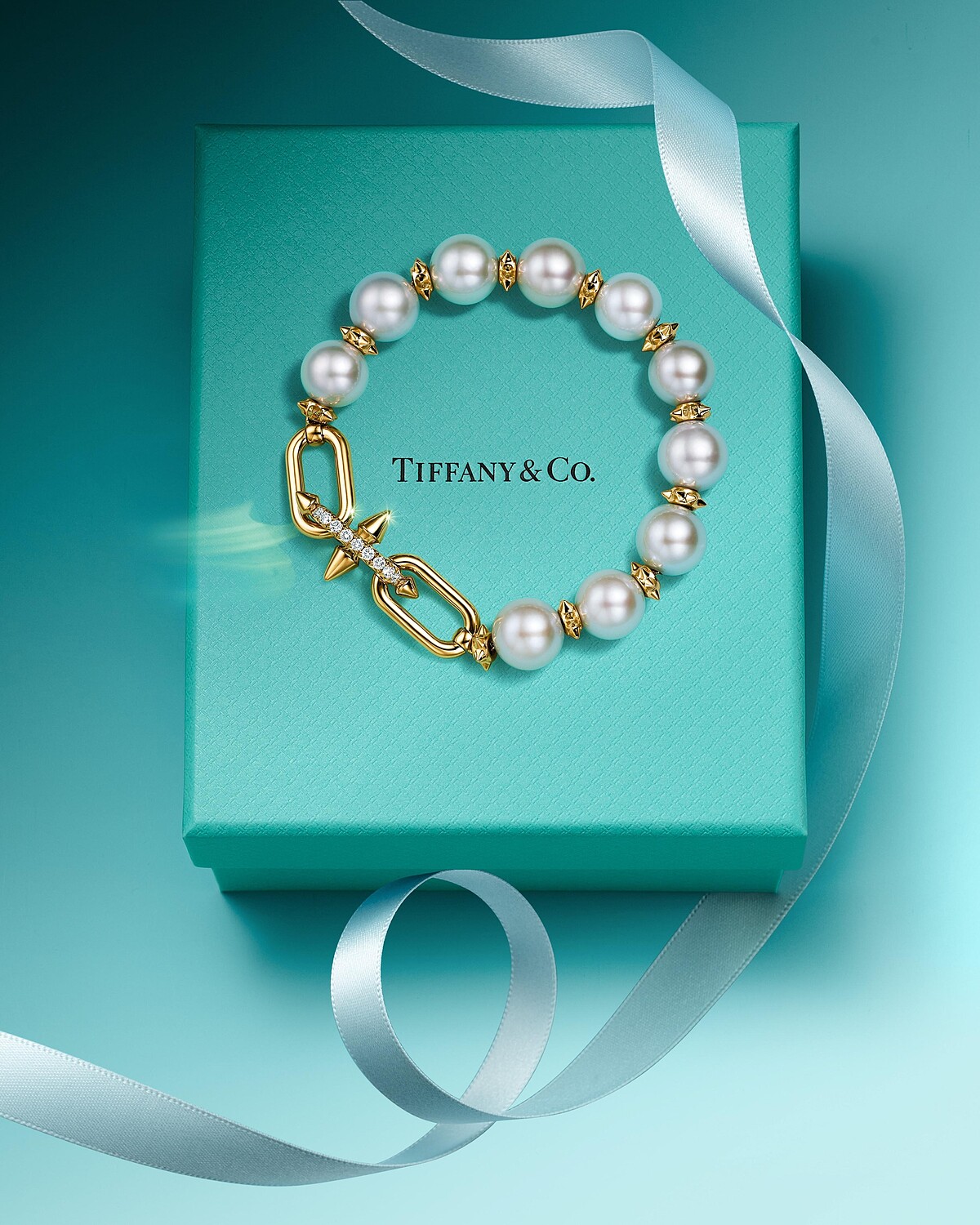 Tiffany Titan by Pharrell Williams系列18K黃金與淡水珍珠鑽石手鍊。由多才多藝的Pharrell Williams操刀的系列,以宇宙中泰坦神話為靈感,結合Pharrell Williams獨特的視角與大膽創意,運用幾何圖形、對比材質和比例遊戲,打造出十分前衛的時尚氣息。