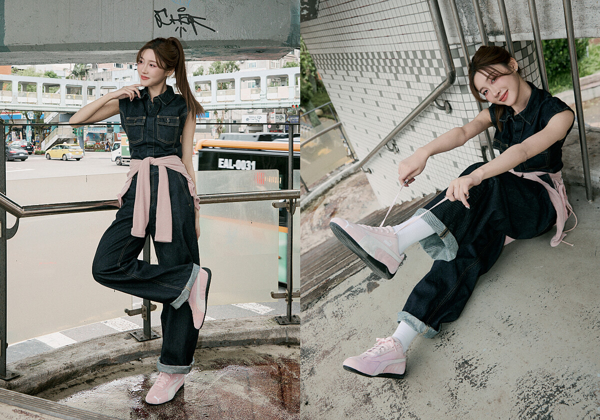 本來就對品味穿搭駕馭自如的Yue悅,穿上深色丹寧連身工作褲,透過在腰間點綴上與櫻花粉PUMA SPEEDCAT鞋款的同色針織衫,以深藍X粉紅的簡約高級雙色組合,型塑出中性兼具柔美特質的帥女孩LOOK。