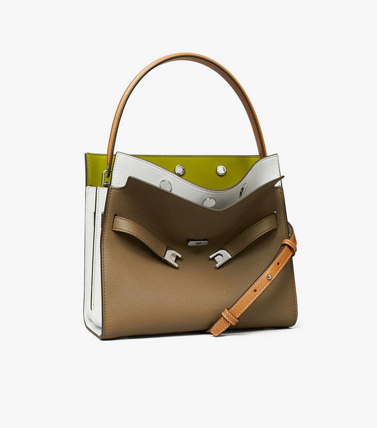 Tory Burch推出的Lee Radziwill手袋系列,以甘迺迪夫人賈桂琳的妹妹Caroline Lee Radziwell女士命名,以汲取她自信時尚的魅力,包款前方有兩條皮革繫帶,來開闔中間的金屬鎖扣,當繫帶垂掛時最能體現此款包的率性風格。