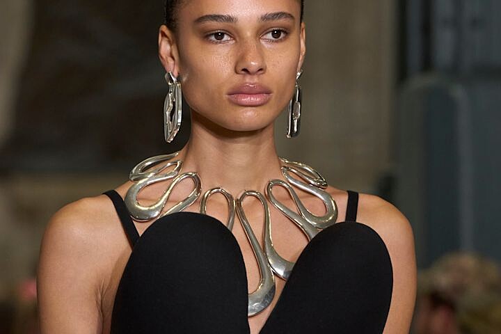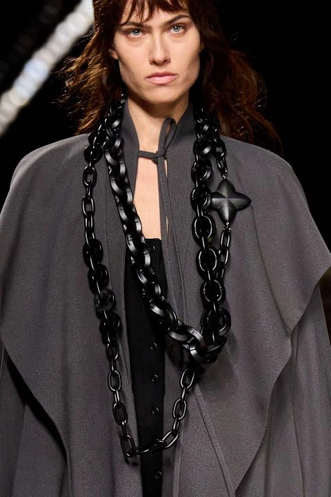 Louis Vuitton 在 2025 春夏的秀上造型中帶來巨大化的項鍊設計,全黑的款式搭配標誌性的品牌語彙,簡單搭配素色上衣就能成為焦點!