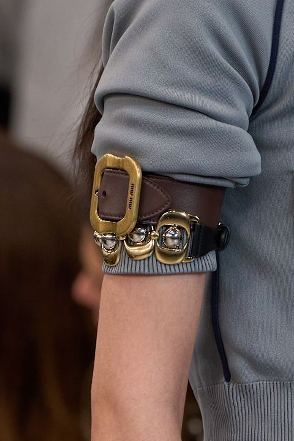 跳脫一般皮帶只能繫在腰間的印象,Miu Miu 在 2025 春夏系列將皮帶轉化為手腕帶,為整體造型增添更多巧思,也讓穿搭更有趣!