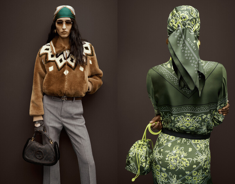 出自藝術家Vittorio Accornero de Testa之手的Gucci Flora花卉圖案得到新的詮釋,並精巧地呈現於服裝之上。新款頭巾飾有漸變款Flora花卉圖案,另有融入馬銜鍊、綁帶等馬術元素的圖案樣式,致敬Gucci經典元素傳承。