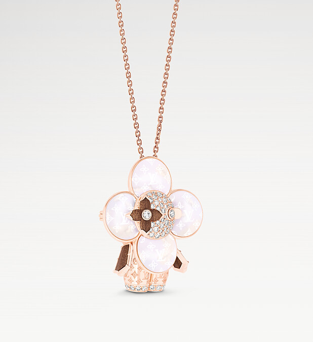 LV路易威登Vivienne Monogram系列玫瑰K金配珍珠母貝、可持續森林的木材(瑞士)及鑽石57顆0.7克拉,高度約35毫米,長度約80厘米(可調節鏈環置於約70及約75厘米兩處),吊墜項鍊也可另作胸針佩戴,NT$ 1,030,000