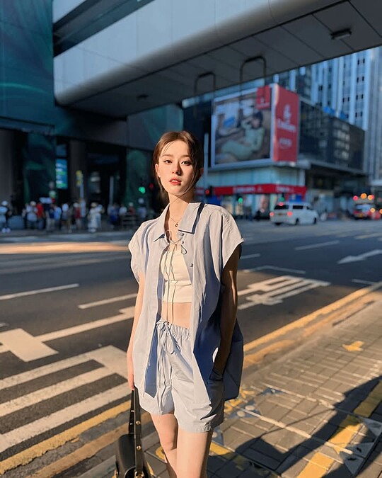 沒什麼比淡藍色的襯衫更適合替夏日增添清新感!邱偲琹的襯衫與同質料短褲套裝,融合了都會休閒與居家舒適的特點,寬鬆同時顯得瀟灑俐落,點綴一顆經典的Gucci 1955馬銜鍊包,便能時髦的走上街頭。