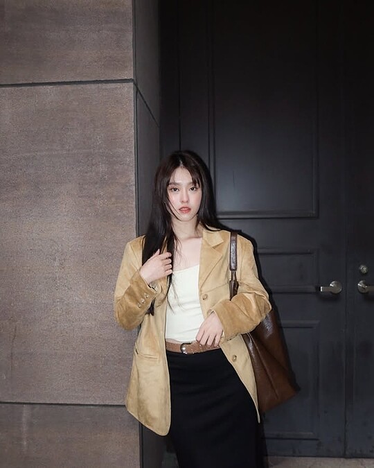 邱偲琹私下與朋友約會時,對於穿搭十分講究,跟上秋冬季節的復古趨勢,她以土黃色麂皮質料的西裝外套來搭配皮質的手袋,裡頭選擇簡單的白色上衣與直筒裙,輕鬆拿捏美拉德風格的時髦精髓。