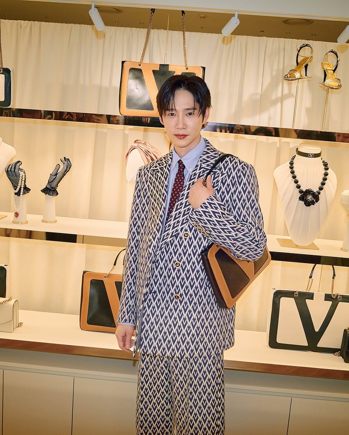 朴成焄擁有非常適合穿西裝的高挑身形,即使是滿版花紋的款式也能駕馭,他在一套復古繁華風格的西裝造型裡,背上一款Valentino新推出的時髦方包,此Valentino Garavani Viva Superstar包款為品牌新任創意總監 Alessandro Michele在2025 早春系列首度推出,俐落輪廓與大尺寸設計不侷限男女使用,背著這款包的朴成焄就像是復古年代的上流人士。