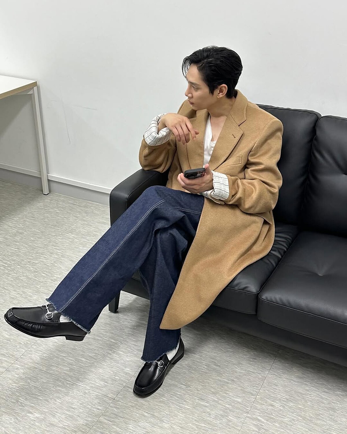 想營造熟男魅力,絕對不能少了一雙時髦的皮鞋!像朴成焄在這身都會雅痞風的穿搭中,便運用Gucci別具辨識度的Horsebit馬銜鍊樂福鞋來收尾,從頭到腳的精緻細節反映出熟男的高雅品味。