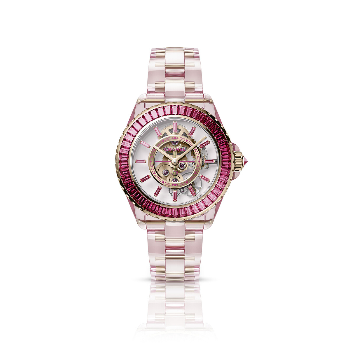 J12 X-Ray 腕錶,粉紅藍寶石水晶與 18K Beige米色金,鑲嵌長階梯型切割粉紅藍寶石,手上鍊鏤空自製機芯,Chanel。