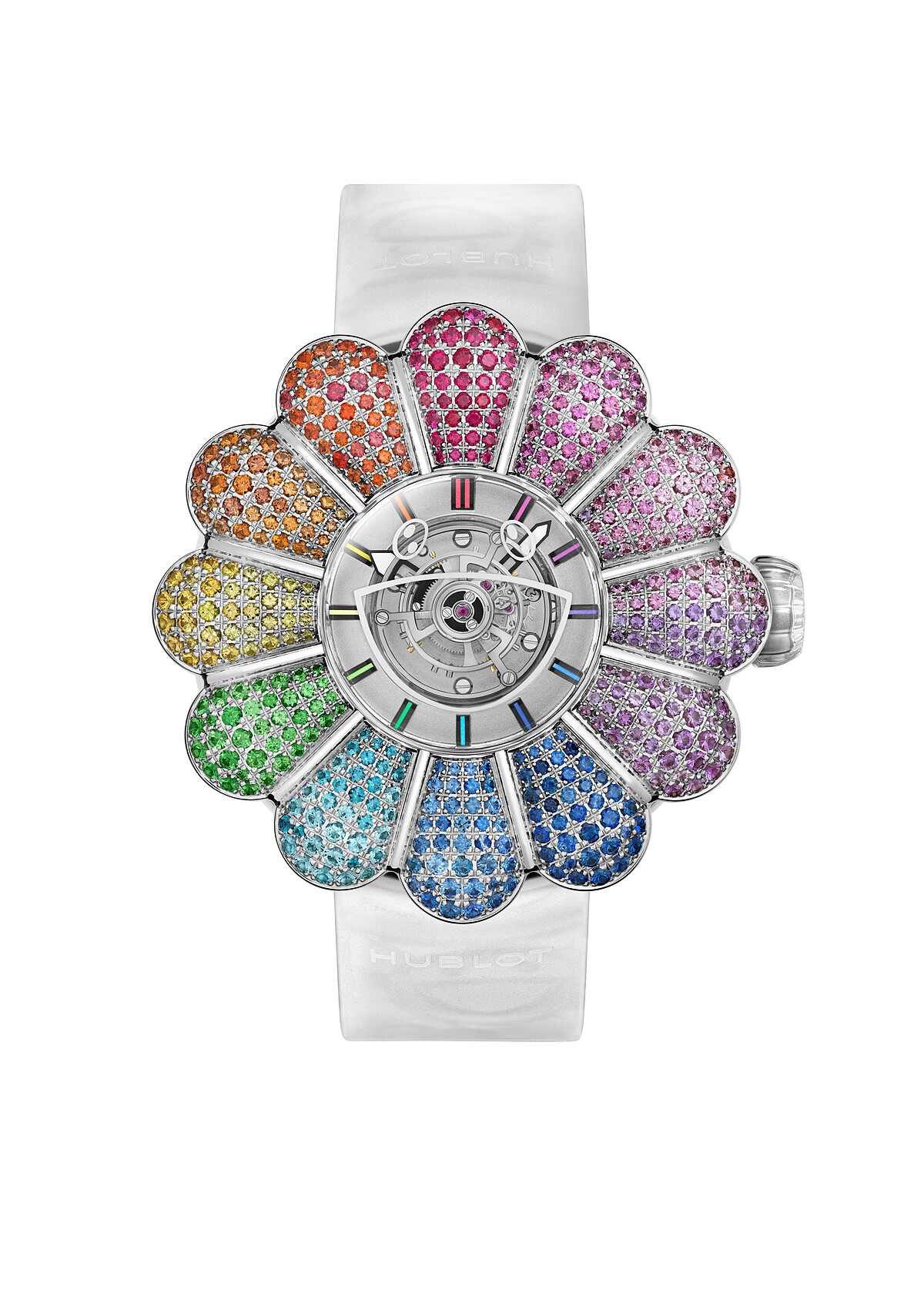 MP-15村上隆陀飛輪藍寶石彩虹腕錶,錶殼直徑42毫米由一整塊藍寶石水晶雕琢而成,鈦金屬錶圈鑲嵌444顆彩色寶石,手上鍊陀飛輪機芯,透明矽膠錶帶飾有村上隆花卉圖騰,限量20只,Hublot。
